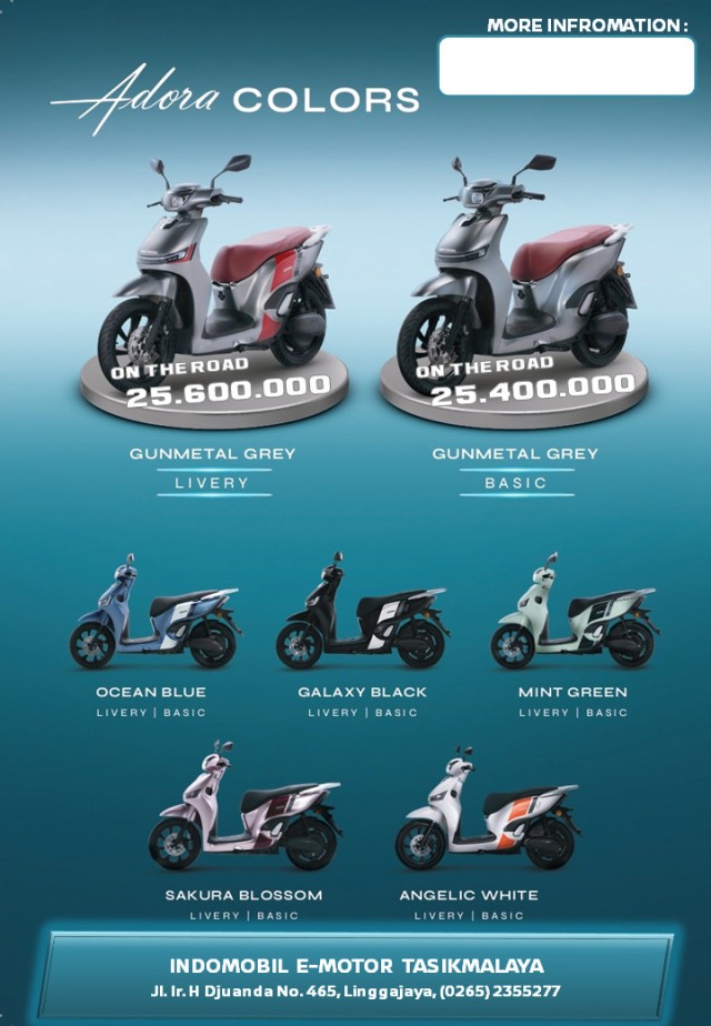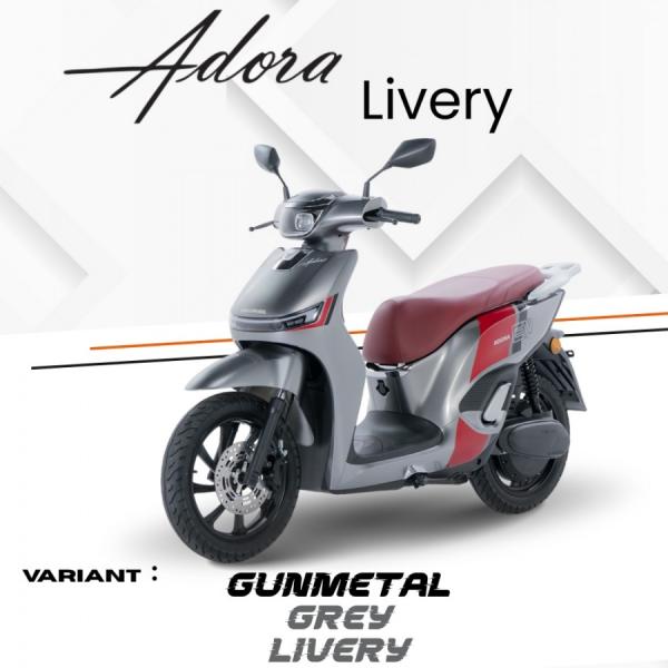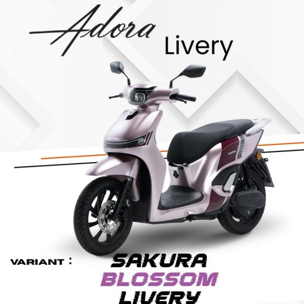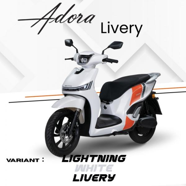 Motor Adora Livery dibedakan melalui desain visual yang lebih sporty dan menarik. Varian ini dilengkapi grafis livery khusus dengan kombinasi warna yang lebih mencolok, sehingga tampil lebih berkarakter dan modern. Adora Livery ditujukan bagi pengguna yang ingin tampil beda dan lebih stylish, dengan harga yang umumnya sedikit lebih tinggi karena nilai estetika tambahan.